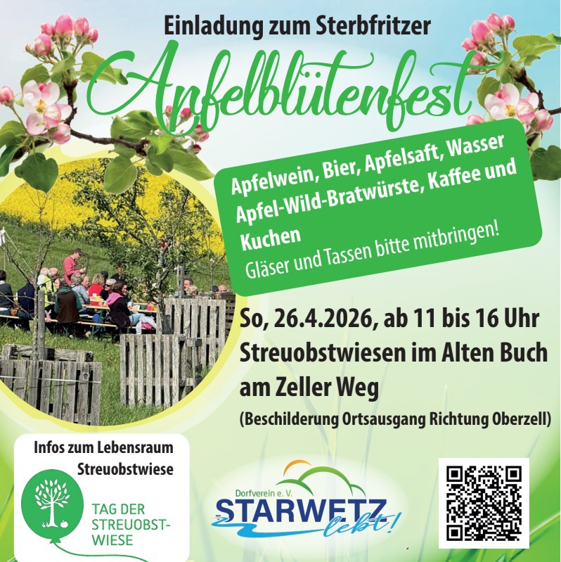 Zum Europäischen Tag der Streuobstwiese lädt der Dorfverein 'Starwetz lebt!' zum Sterbfritzer Apfelblütenfest ein: