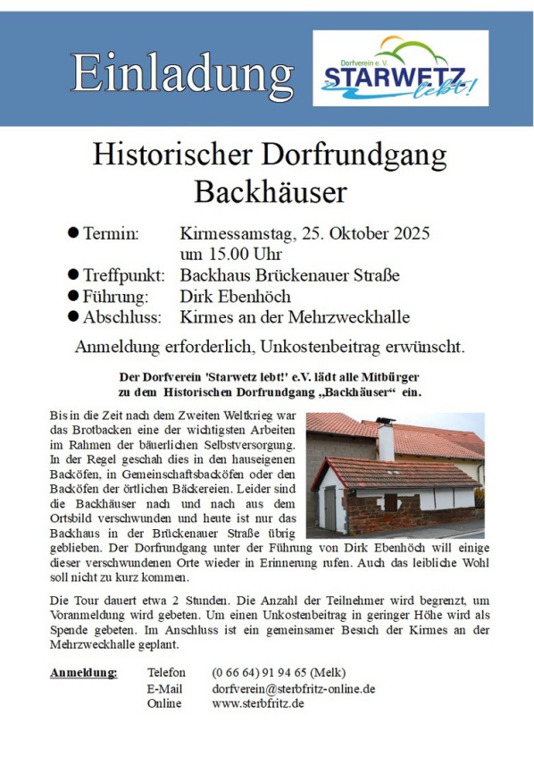 Die Chronikgruppe, die mittlerweile im neu gegründeten Dorfverein beheimatet ist, hat sich nun entschlossen, ihre Forschungsergebnisse auch in einer weiteren, unterhalt-samen Form den Bürgern zur Information zu bringen. Flurbegehungen und Dorfrundgänge mit wechselnden Themen sollen neben dem Wissen über die Sterbfritzer Geschichte auch spaßige Anekdoten und dörfliche Besonder-heiten vermitteln.