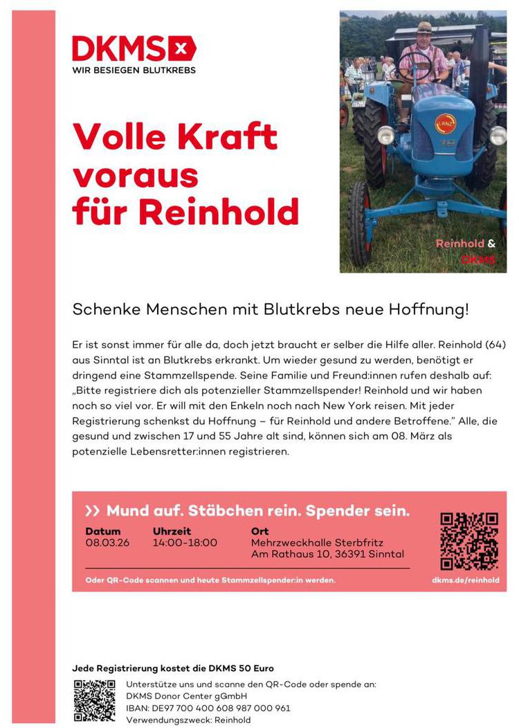Ein Bürger unserer Gemeinde braucht Ihre Hilfe. Machen Sie mit bei der Registrierungs- aktion am 3. März, 14 bis 18 Uhr in der Mehrzweckhalle Sterbfritz!
